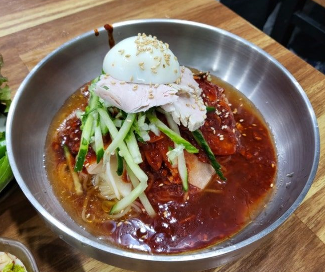 먼저 밀면을 한 입 먹어보았습니다. 차가운 육수에 잘 삶아진 면발과 신선한 채소, 그리고 고소한 참깨가 어우러져 정말 맛있었습니다. 부드러운 계란과 함께 먹으니 더욱 풍미가 살아나는 느낌이었습니다. 정말 여름철에 어울리는 시원한 맛이었습니다.