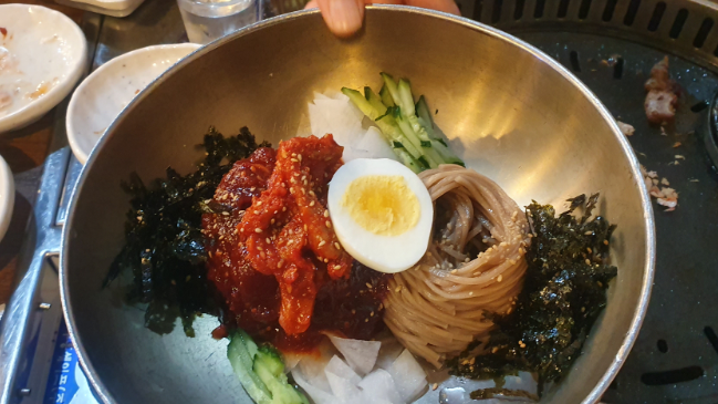 고기를 주문하면, 테이블에 설치된 그릴에서 직접 구워 먹는 재미가 있습니다. 두툼한 삼겹살이 그릴 위에서 지글지글 구워지는 모습은 군침을 돌게 합니다. 고기가 잘 구워지면, 바삭한 식감과 함께 고소한 맛이 입안 가득 퍼집니다.