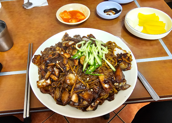 소스 속에는 다진 고기와 양파, 애호박, 양배추가 풍부하게 들어 있어 씹는 맛이 좋고, 소스의 농도가 너무 묽지도 되지도 않아 면에 착 감기는 질감이 뛰어납니다. 면은 탱글한 중화면으로 국수 전문점 못지않은 식감을 자랑하며, 먹다 보면 젓가락을 멈출 수 없을 만큼 중독성 있는 짜장면을 경험할 수 있습니다.