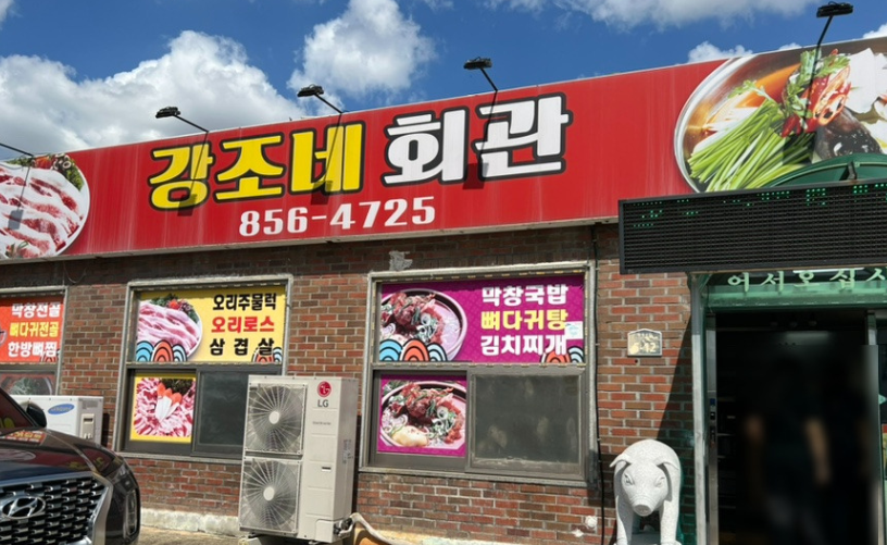 강조네회관의 외관은 붉은색 간판이 눈에 띄며, 벽돌로 지어진 건물입니다. 큰 창문을 통해 내부의 음식 사진들이 보이며, 밝고 아늑한 분위기를 자아냅니다. 입구는 유리문으로 되어 있어 깔끔한 인상을 주며, 주변에는 다양한 메뉴를 안내하는 추가 간판도 있습니다.