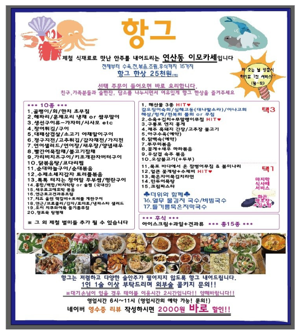 부산 연제구 연산동에는 정성 어린 한식으로 꾸준히 사랑받는 향그라는 음식점이 자리하고 있습니다. 깔끔한 인테리어와 따뜻한 분위기 속에서 다양한 한식 메뉴를 즐길 수 있으며, 특히 정갈하고 담백한 맛 덕분에 직장인 점심 모임이나 가족 외식 장소로도 인기가 높습니다. 합리적인 가격에 건강한 식사를 즐길 수 있는 곳으로, 지역 주민들의 단골집으로 자리 잡았습니다.