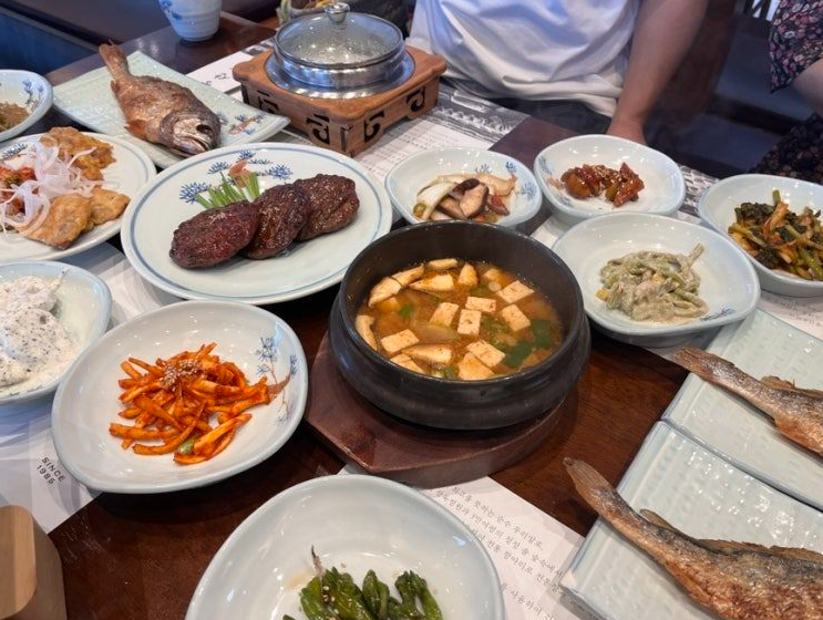 이곳의 메뉴는 전통 한정식으로, 다양한 한국 요리를 제공합니다. 특히, 보리굴비와 떡갈비, 육전, 된장국 등은 이곳의 대표적인 요리입니다.