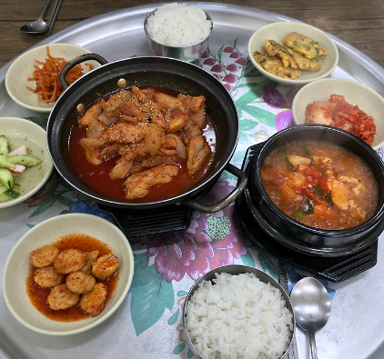 부산 금정구 장전동의 조용한 골목 안에 위치한 부광식당은 특별한 간판도 없고 화려한 메뉴판도 없지만, 매일 정성껏 차려지는 백반 한 상으로 입소문을 타고 있는 집이다. 가장 큰 매력은 바로 매일 달라지는 메인 요리다. 월요일엔 돼지불백, 화요일엔 고등어조림, 수요일엔 제육볶음처럼 그날그날 다른 주재료로 구성되어 있어 매일 가도 식상이 없다. 그 외 밑반찬은 직접 담근 나물류와 계절김치, 달걀말이, 감자조림 등 부담 없고 담백한 구성이다. 국은 맑은 국에서부터 된장찌개, 북어국 등 다양하게 돌아가며 제공되며, 식사의 완성도를 높인다. 특히 1인 세팅이지만 밥과 국, 반찬의 조화가 잘 맞춰져 있어 마치 집에서 엄마가 차려주는 밥상 같은 느낌을 준다. 인공적인 조미료를 배제한 듯한 순한 맛 덕분에 어르신부터 젊은 세대까지 모두에게 호불호 없는 맛을 제공하는 것이 장점이다.