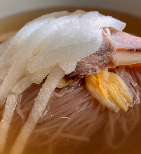 평양냉면을 주문하면 따로 요청하지 않아도 잘 익은 백김치, 무말랭이, 김 등이 소박하게 제공되며 모든 반찬은 강하지 않고 냉면의 맥을 해치지 않는 수준에서 정리되어 있습니다. 심지어 단무지조차도 직접 담근 것 같은 은은한 맛을 느낄 수 있죠.